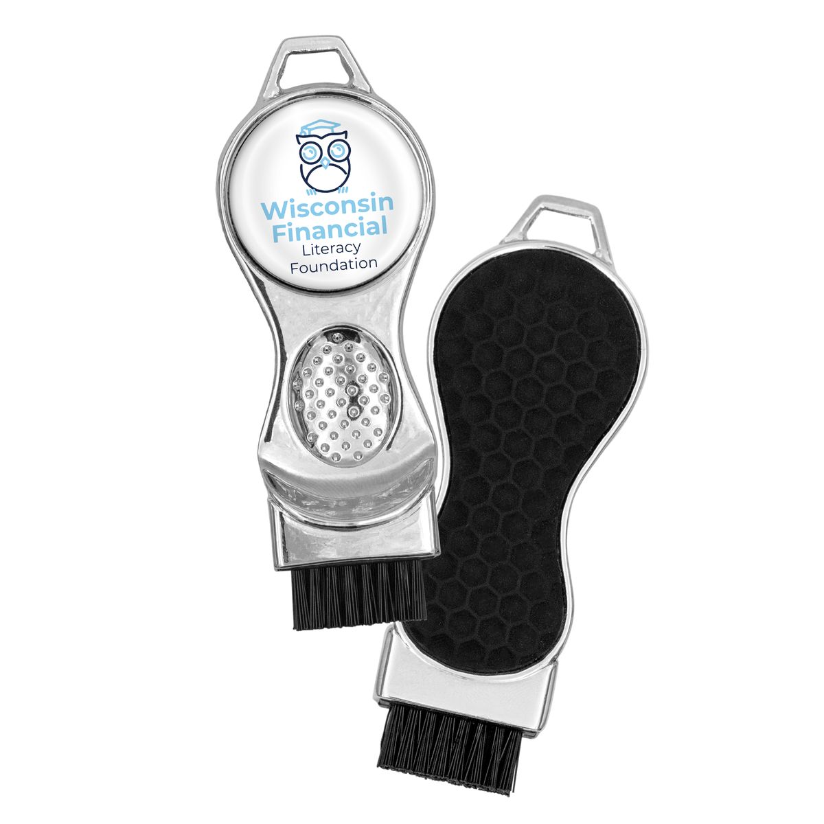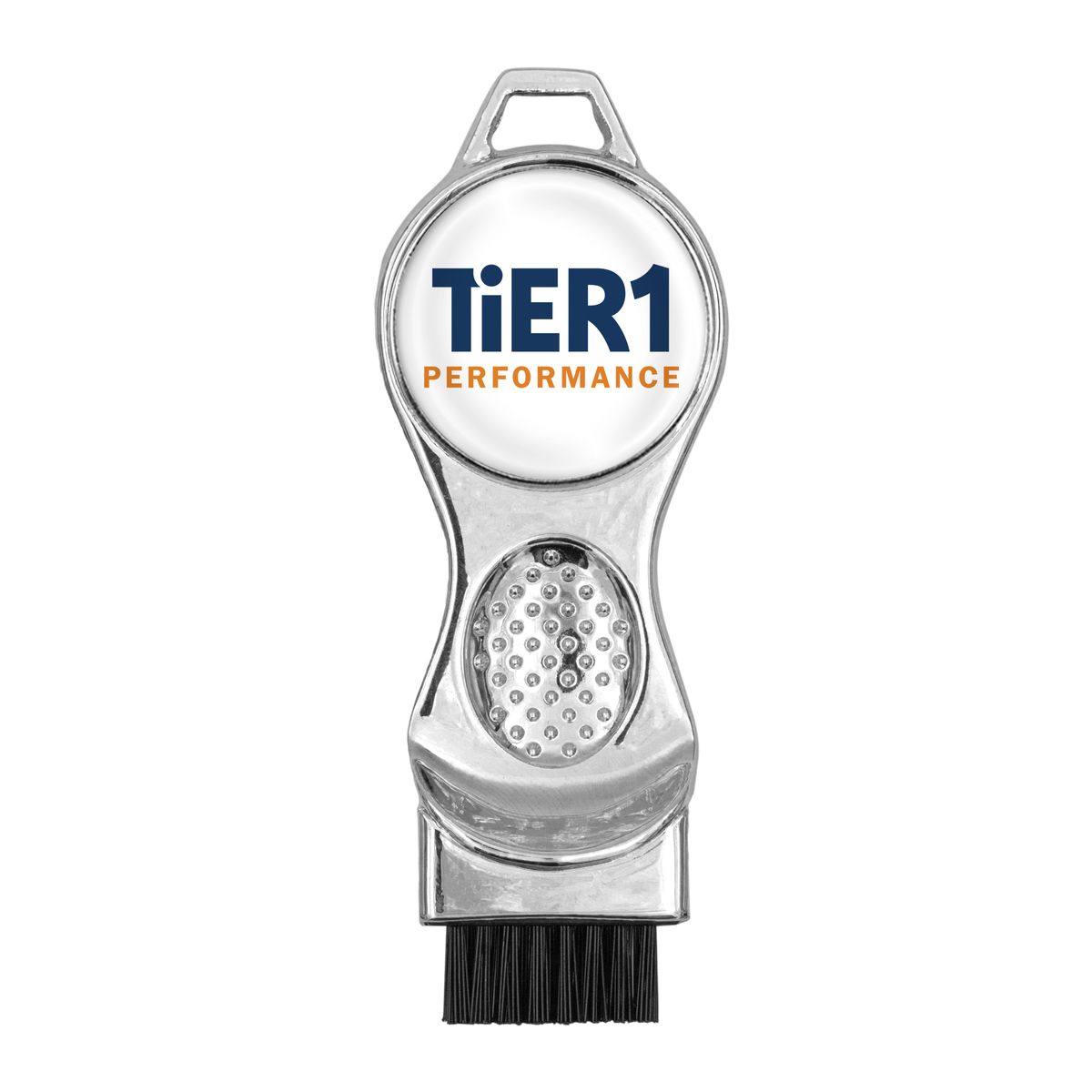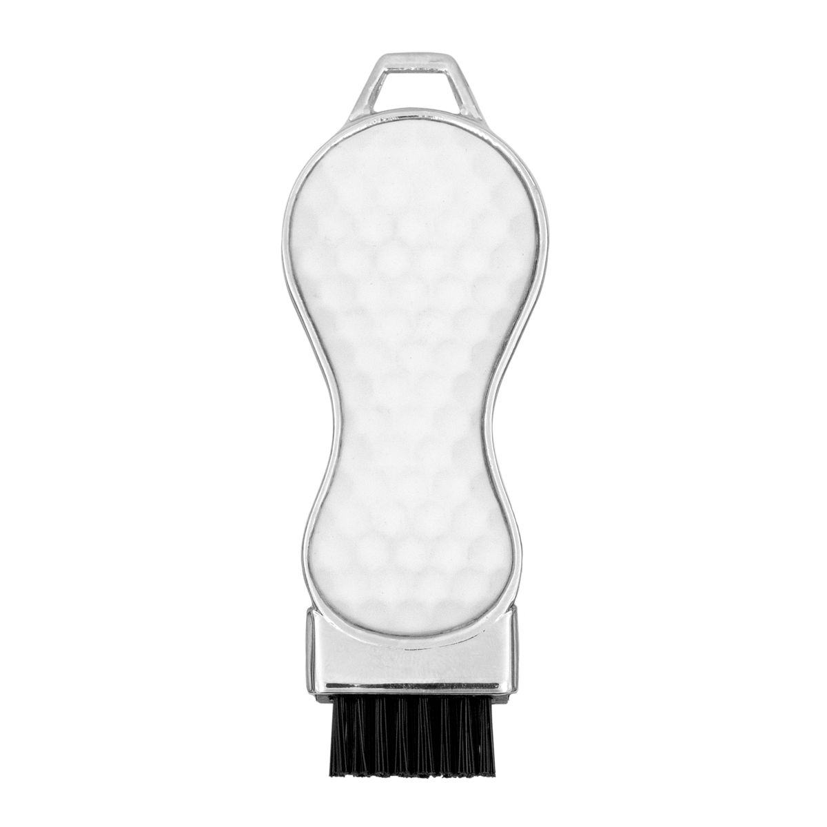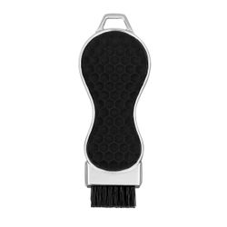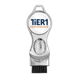 Keep your clubs game ready with the Contour 3-in-1 multifunction die cast golf brush tool. The Contour’s sleek, ergonomic design features a shiny nickel finish, soft textured PVC grip, and thumb rest for superior leverage. Brushes include an integrated golf club groove cleaner and removable ball marker with full color poly dome imprint. Choose from 3 popular handle colors. Fast 6 working day production standard.